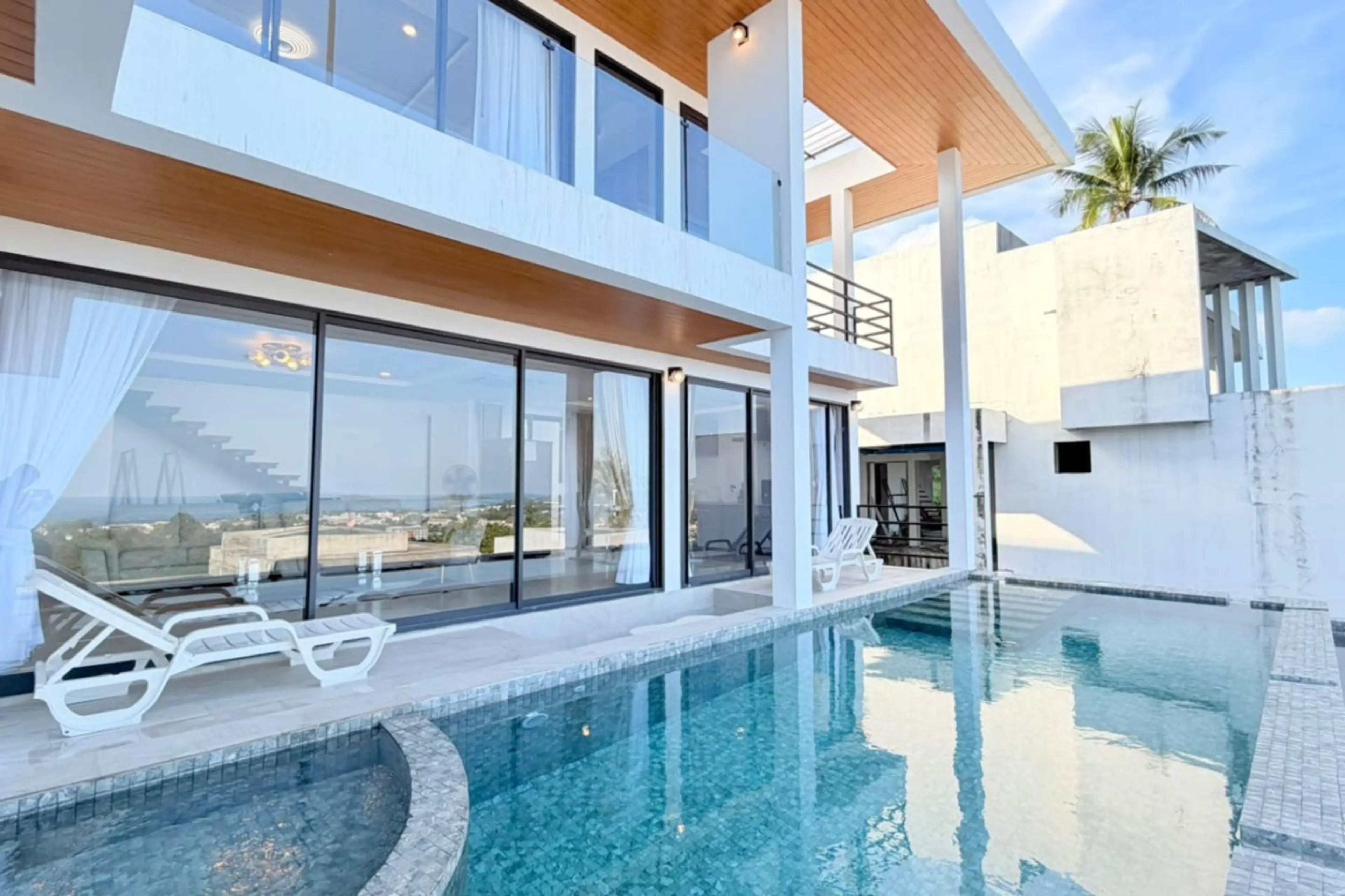 Wake up to sweeping ocean views in this modern 3-bedroom, 3-bathroom luxury villa in Koh Samui. Designed for comfort and style, the home features spacious ensuite bedrooms, an open-plan living area, a fully equipped kitchen, and floor-to-ceiling glass doors that frame the sea. Step outside to your p...